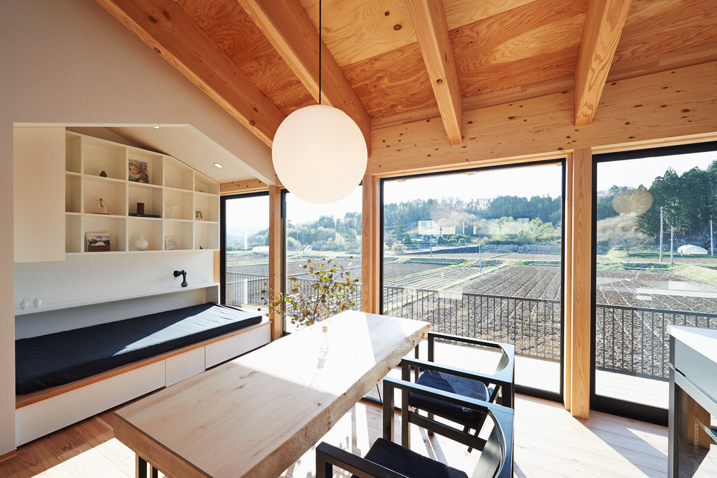 景色に向かって広がる多機能な縁側デッキ、仕事と家族と暮らしをつなげる通り土間、上下階をひとつながりにする一室 空間。居間の傍らにあるちいさなとんがりやねはお昼寝デイベッドスペース。