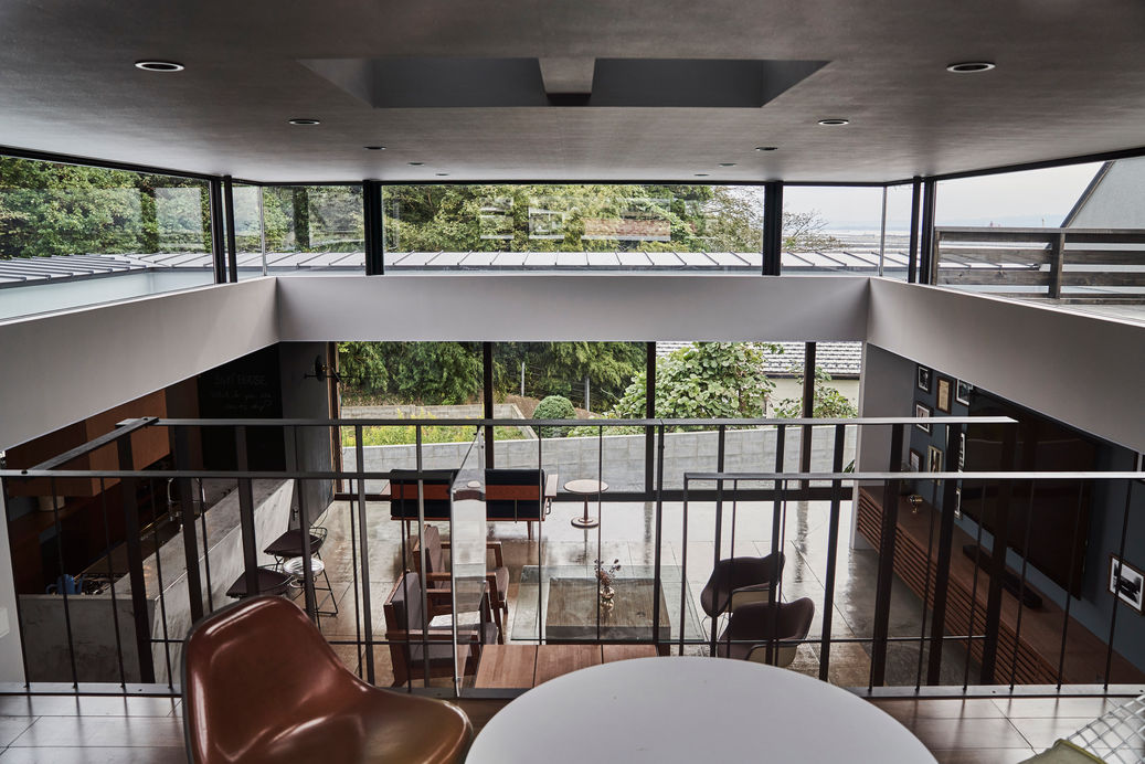 敷地高低差はビルトインガレージに姿を変え、高床式の1階は視線を海へとすくい上げる。